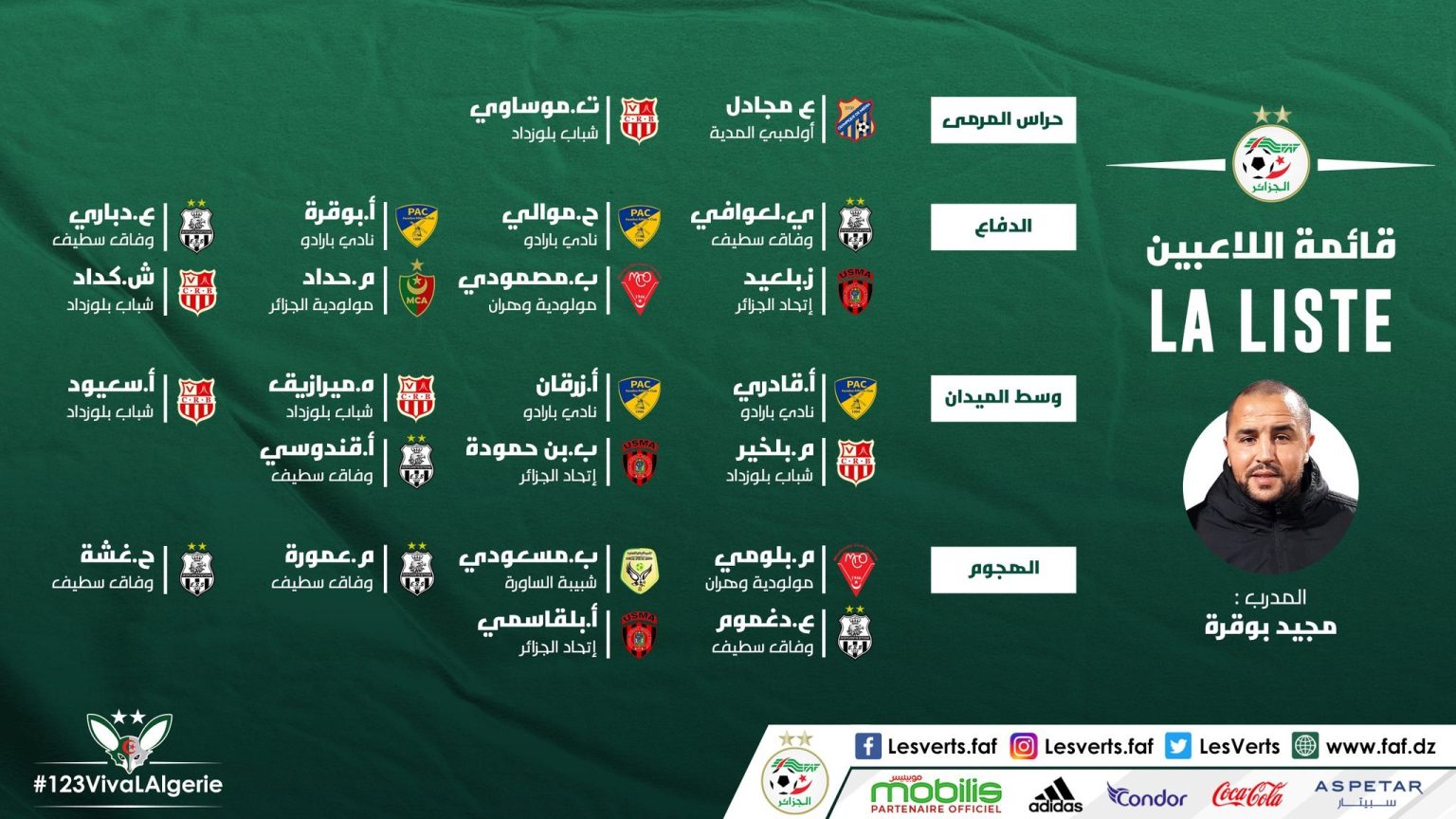 كشف مدرب المنتخب الوطني للاعبين المحليين، عبد المجيد بوقرة، اليوم الإثنين، عن القائمة المعنية بدخول التربص المغلق الذي سينطلق يوم الـ 13 من الشهر الجاري، بالمركز الفني الوطني بسيدي موسى بالعاصمة، تحسبا للمباراة الودية التي تنتظر المنتخب المحلي أمام منتخب البورندي .