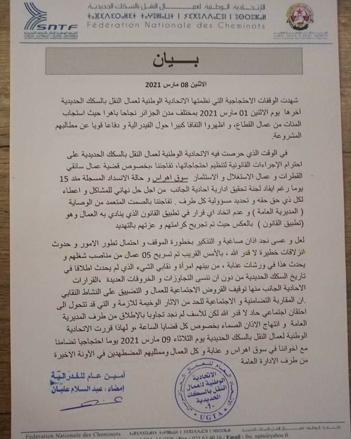 ومن جانبها، ردّت الشركة الوطنية للنقل بالسكك الحديدية، عبر منشور بالفايسبوك، على قرار الإضراب الذي أعلنت عنه الاتحادية أمس الاثنين.